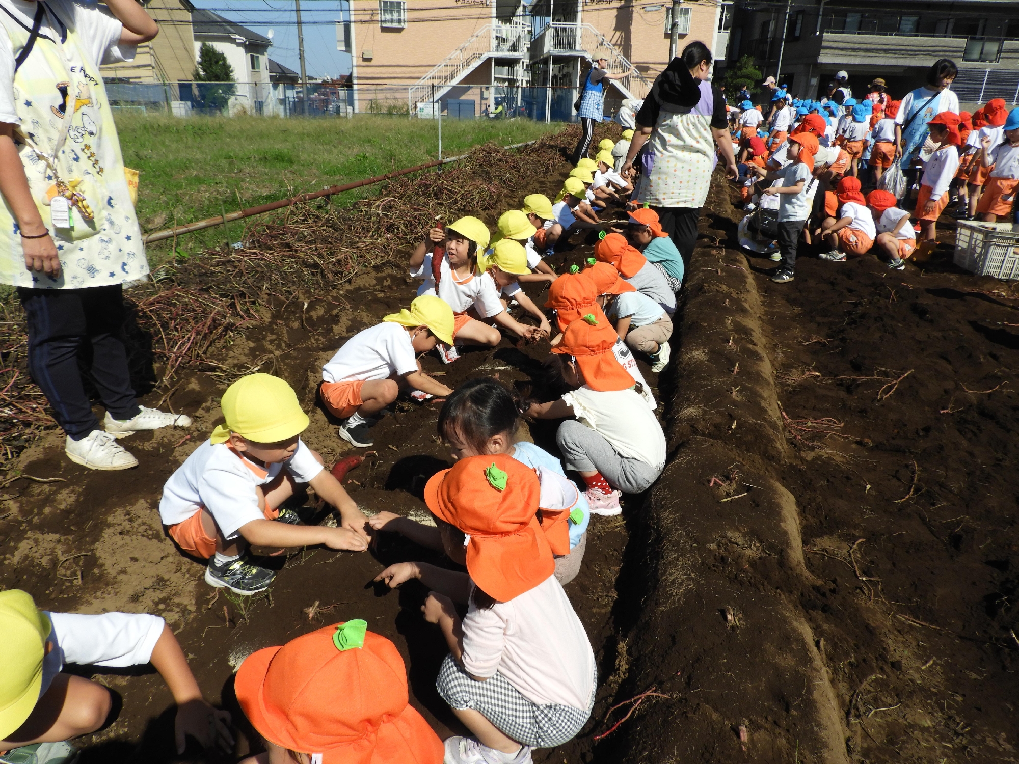 年中さんは力いっぱい畑を掘って、顔より大きな